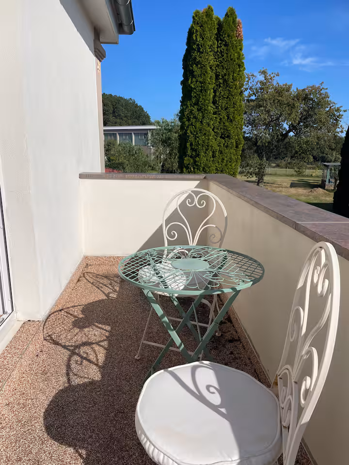Außerdem kannst du im Obergeschoss einen Balkon nutzen, mit einem Tisch und Sitzgelegenheit für 2 Personen.